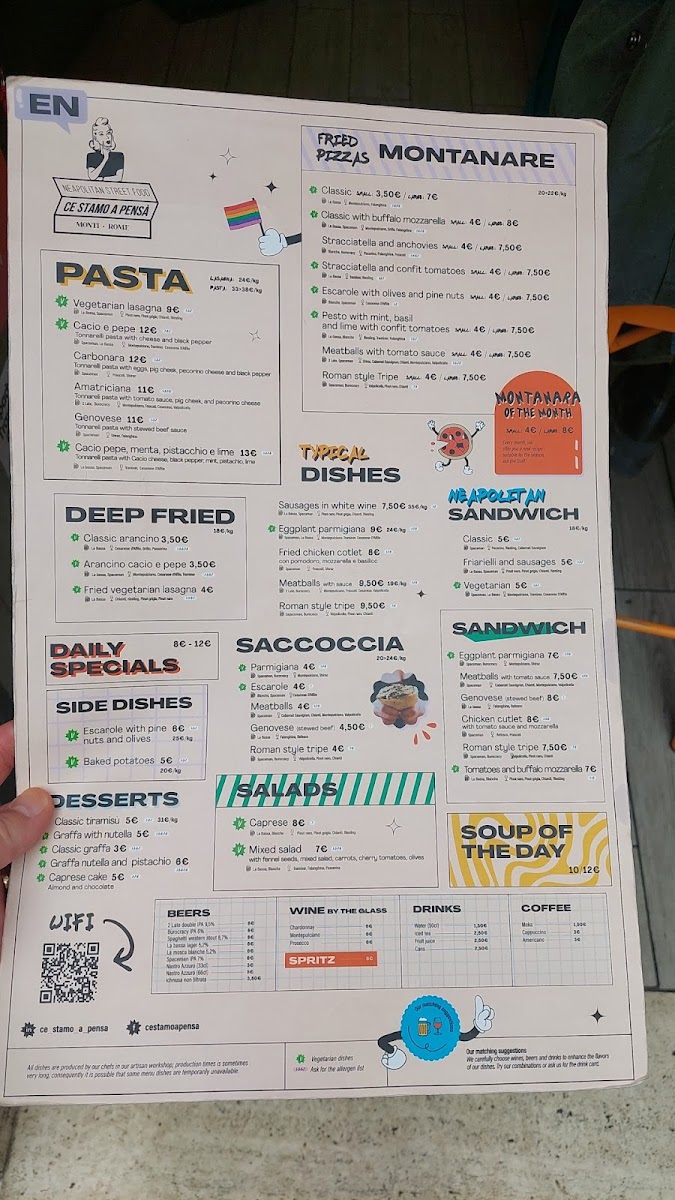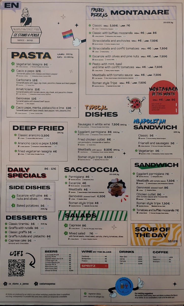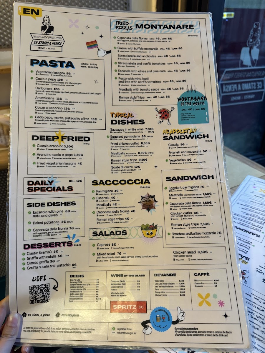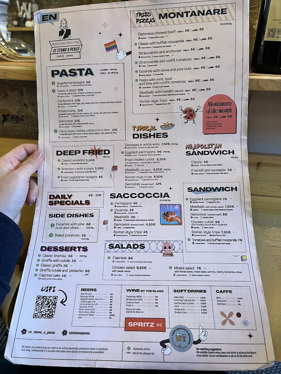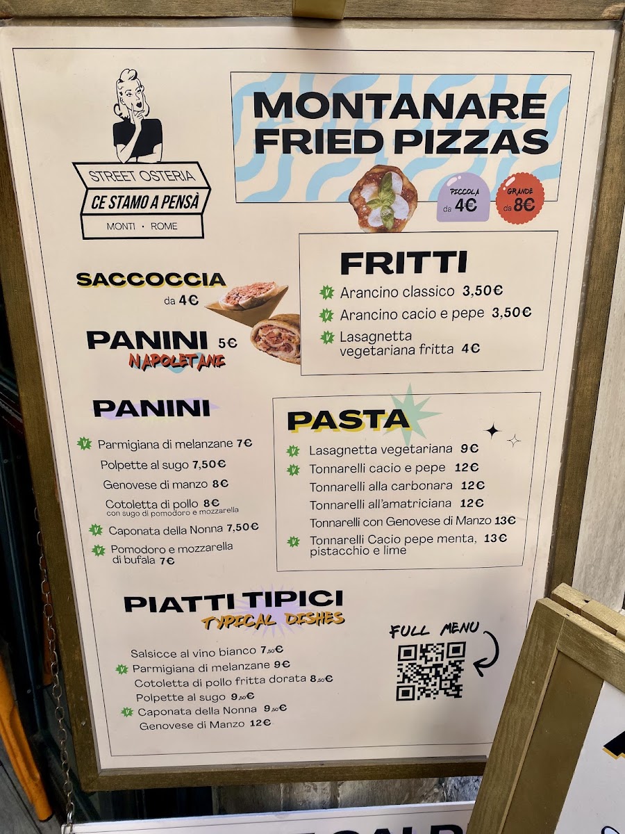 The menu at Ce Stamo A Pensà offers a variety of dishes characteristic of Roman, Neapolitan, and Southern Italian cuisines. It includes traditional pasta plates such as Spaghetti Carbonara and Amatriciana, alongside regional specialties like Buffalo Mozzarella Pizza and Classic Arancino. The selection also features vegetable-based dishes including Eggplant Parmesan (Parmigiana Di Melanzane) and Caprese Salad.