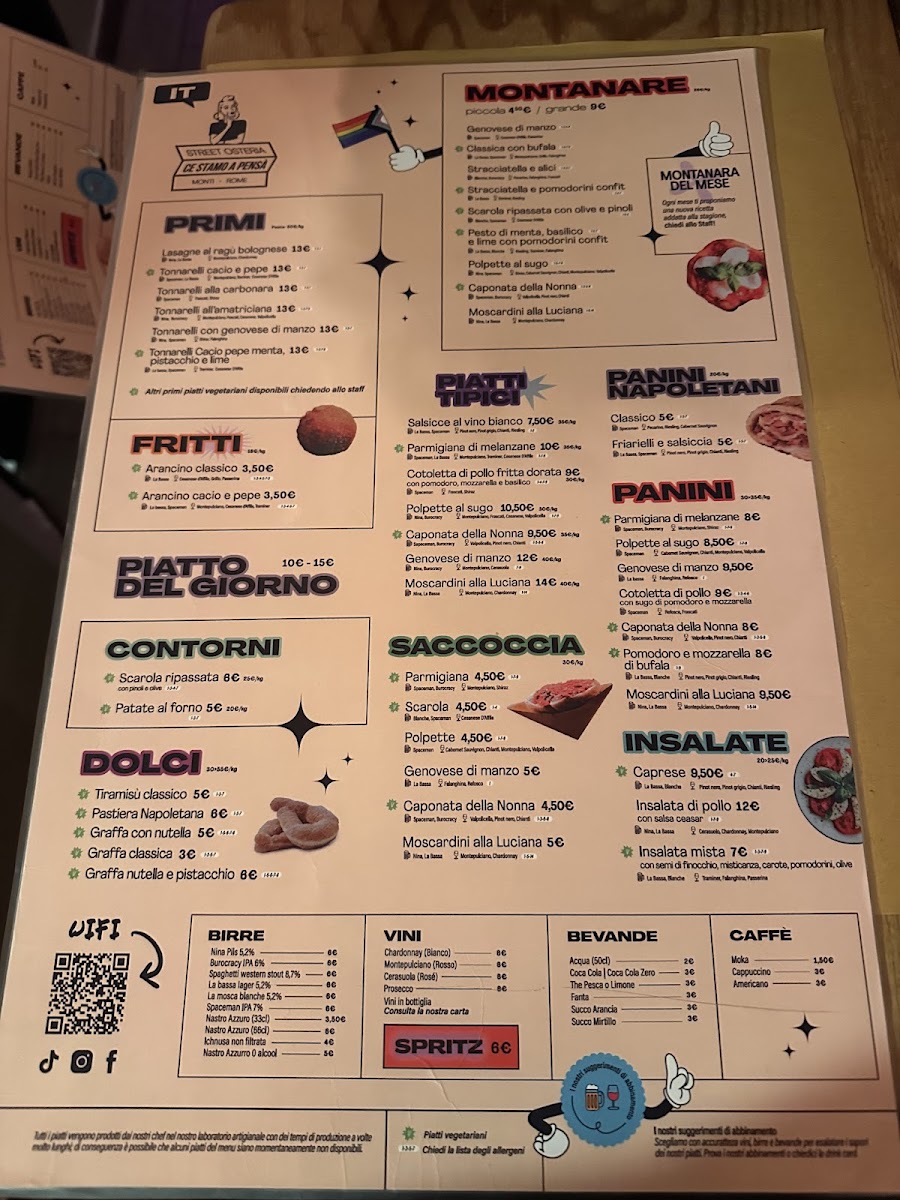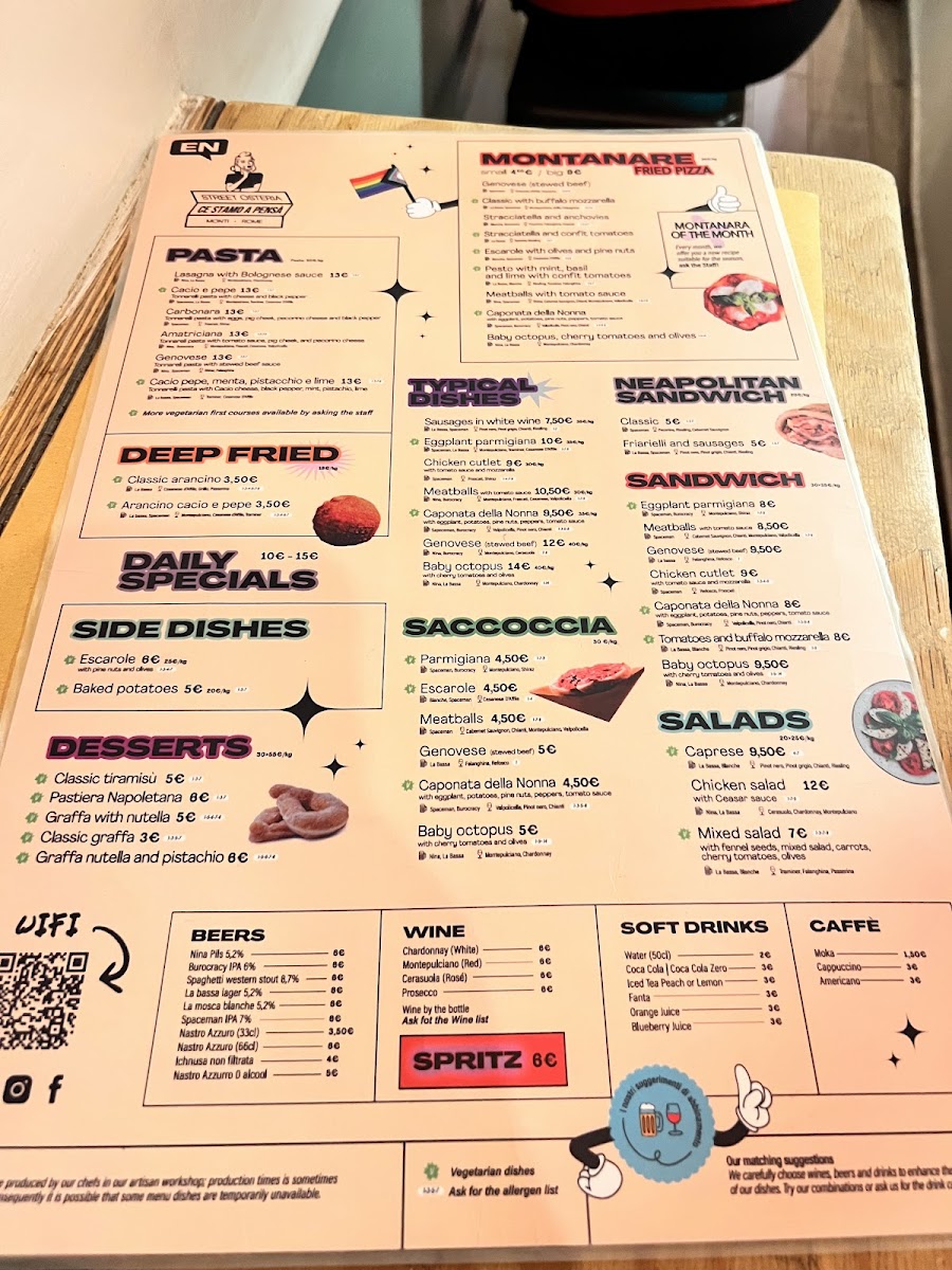 For lighter options or snacks, the menu presents items like the Neapolitan Sandwich and Friarielli Sausage with Provola Cheese. Desserts include traditional Italian sweets such as Tiramisu. Beverage choices complementing the food range from white wines and beer to popular Italian aperitifs like Aperol Spritz.